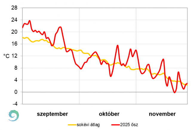 A 2025-ös ősz napi középhőmérsékleteit és a sokéves átlag értékeit a 9. ábrán mutatjuk be. Az évszak 91 napjából 52 napon a normálnál magasabbak voltak a napi átlaghőmérsékletek. Szinte az egész szeptember melegebbnek adódott a megszokottnál, 5-e lett az évszak legmelegebb napja, amikor 23,7 °C volt a napi középhőmérséklet. Ezen a napon mértük ősszel a legmagasabb hőmérsékletet (35,1 °C) is Körösladányban és Körösszakálon, ami egyben új országos napi melegrekord. A normáltól való legnagyobb pozitív eltérés 22-én adódott, több, mint 7 fokkal volt melegebb az átlagnál. 25-én kezdődött egy erőteljes lehűlés, mely hideg periódus október 8-ig tartott. Október 3-án éltük át a legnagyobb negatív anomáliát: országos átlagban 6,2 °C-kal maradt el a hőmérséklet az 1991-2020-as értéktől. Ezt követően a sokéves átlagnak megfelelően alakult időjárásunk, majd két hidegebb nap (19-20) után melegedés volt megfigyelhető. A hónap végén és november elején már 4-6 fokkal mértünk magasabb hőmérsékletet, mint ilyenkor az szokásos. November közepén a Kárpát-medencét több napig egy hidegpárna töltötte ki, majd melegedés kezdődött, mely 17-én tetőzött. Viszont az ekkor érkező markáns hidegfront mögött már sarkvidéki eredetű hideg levegő áramlott hazánk fölé. Az ősz leghidegebb napján, 23-án fagypont alá süllyedt a napi középhőmérséklet (-0,2 °C).