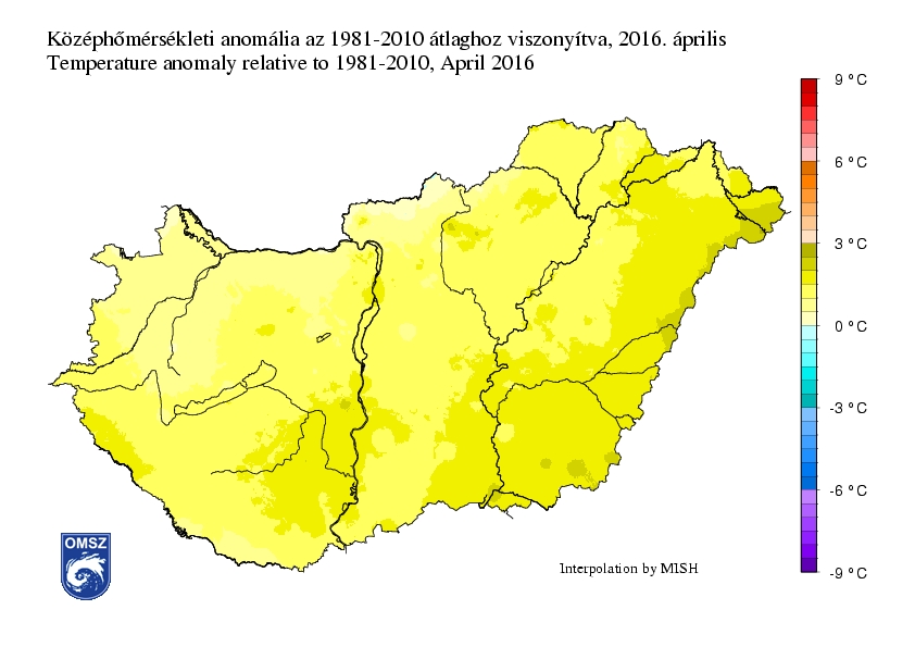 Az 1981-2010-es átlagnál hűvösebb április sehol nem fordult elő az országban. A Kisalföld térségében és az Ipoly mentén 0,5 °C-kal, az ország keleti határszélén 2,5-3 °C-kal haladta meg az anomália értéke a sokéves átlagot.