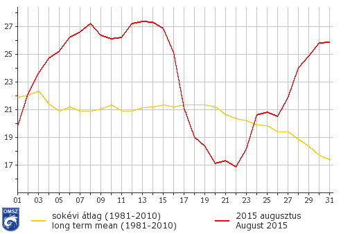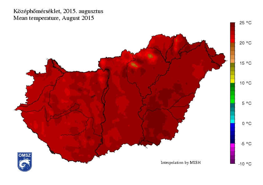 Országos átlagban 2,7 °C-kal melegebb volt az idei augusztus az 1981-2010-es évek átlagánál, azaz a normál időszaknál. Az országos átlaghőmérséklet kiemelkedőnek számít az 1901-től induló sorokban is: 2015 augusztusa a 3. legforróbb augusztus volt az elmúlt 115 év viszonylatában. A legnagyobb anomáliák jellemzően az ország északi felében fordultak elő, az adott területen megszokott átlaghőmérsékleteknél nem ritkán 4-5 °C-kal is magasabb értékeket kaptunk eredményül.