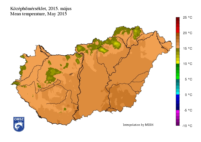 Májusban az ország területén a középhőmérséklet zömmel 15-18°C között alakult, néhány fokkal alacsonyabb értékeket regisztráltunk a hegyvidéki területeken. Országos átlagban 15,9 °C volt. Kékestetőn volt a leghidegebb (10,9 °C), míg Szeged belterület állomáson a legmelegebb (17,9 °C). A legmagasabb napi maximumhőmérsékletet (31,4 °C) a déli határ közelében mértük: Baja Csávoly, Kelebia, Kiszombor állomásokon. A legalacsonyabb napi minimumhőmérsékletet (-0,8 °C) a hónapban Zabaron mutatta a hőmérő.