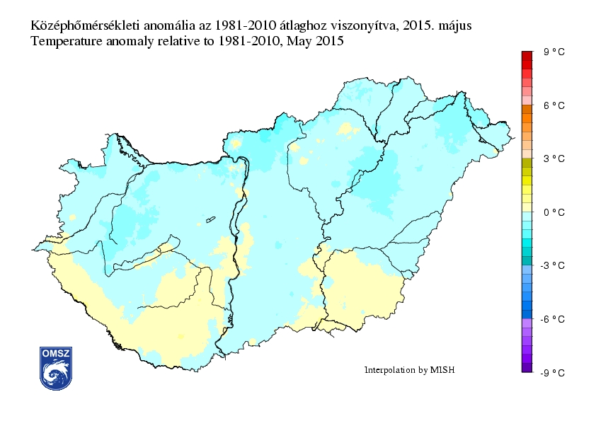 Országos átlagban 0,3 °C-kal volt hűvösebb az 1981-2010-es normálértéknél. A Dunántúl déli, délnyugati és az Alföld délkeleti részén egy kicsivel (0-0,5°C) melegebb volt az átlagnál, ezzel szemben az ország többi részén (0-1 °C) negatív anomália volt jellemző.