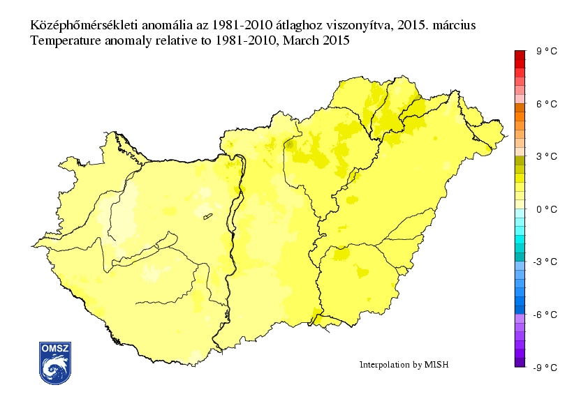 A március melegebben kezdődött a megszokottnál, és a hónap nagy részében átlag feletti hőmérséklet volt jellemző. Csupán néhány napig tartó időszakokban maradt a napi középhőmérséklet az országos átlag alatt. A leghidegebb napon (március 7.) országos átlagban 2,6°C volt középhőmérséklet, ami mindössze 0,3°C-kal maradt el az 1981-2010-es normál értéktől. A legmelegebb napon (március 26.) 12,9°C-ot mértünk, mely közel 5°C-kal haladta meg az országos átlagot.