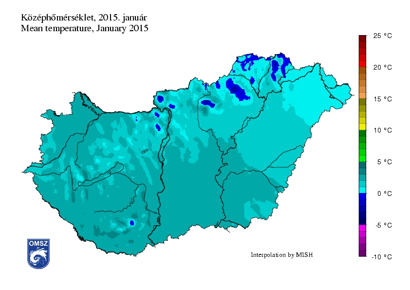 A januári átlaghőmérséklet +1 és 3 °C között alakult hazánk legnagyobb részén. Ennél hidegebb az ország északkeleti sarkában (0-1 °C), illetve a magasabban fekvő területeinken volt jellemző (-3 és 0 °C között). Zömmel DNy-ÉK irányú csökkenés látható a havi átlaghőmérséklet országos térképén.