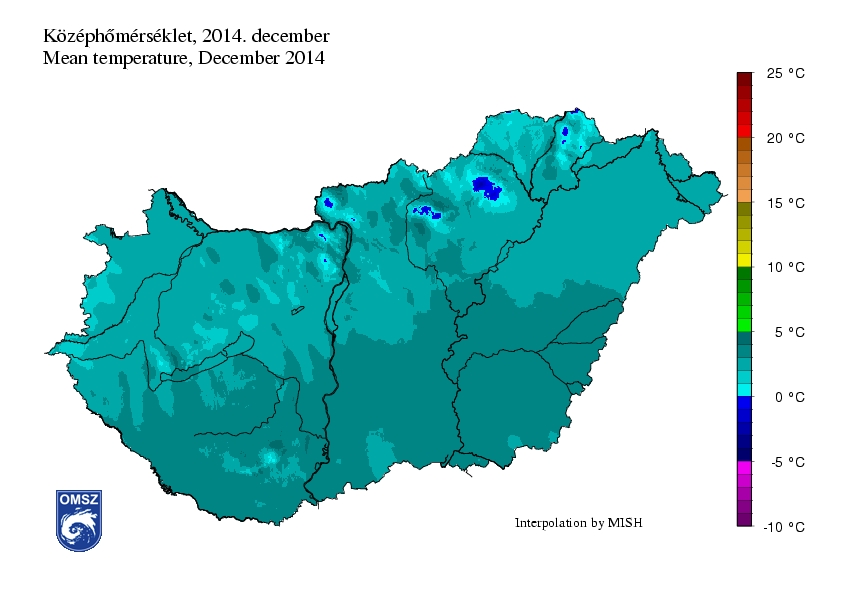 Decemberben az ország nagy részén 2-4°C között alakult a havi középhőmérséklet, az értékekben megfigyelhető egy É-D irányú növekedés. A legalacsonyabb értékek a magasabban fekvő területeken alakultak ki, itt egyes helyeken a középhőmérséklet 0°C alatt maradt.