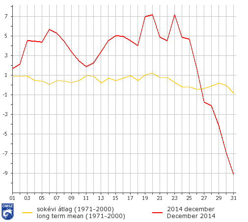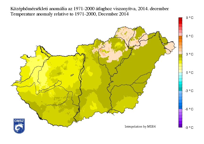 2014 decemberét középhőmérséklet szempontjából az egész országban pozitív anomália jellemezte, a normálnál átlagosan 2-3°C-kal volt melegebb. A legkisebb pozitív anomália északnyugaton volt, mindössze 1-1,5°C, míg a legnagyobb anomália 3-4°C az északkeleti területeken volt jellemző.