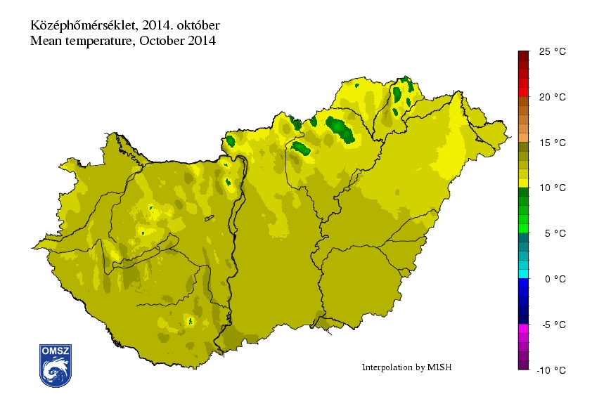 Októberben az országos átlaghőmérséklet 12 °C volt. A legmagasabb havi átlagot Budapest belterületen jegyezték (13,9 °C), a legalacsonyabbat Kékestetőn (7,9 °C). Az ország nagy részén a havi átlag 11 – 13 °C között alakult. A magasabban fekvő területeken volt ennél pár fokkal hűvösebb. DNy-ÉK irányú csökkenést láthatunk az 1. ábrán.