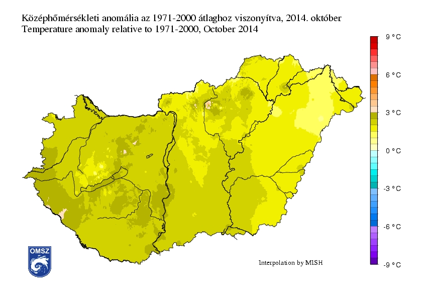Az országos átlag a normál értéknél 1,6 °C –kal volt magasabb; a sokéves átlag 10,6 °C. ÉK- en kisebb volt az eltérés, a Bakony térségében pedig a legnagyobb. Az ország legnagyobb részén 1,5 – 2,5 °C – kal volt melegebb a megszokottnál.