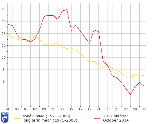 Napi középhőmérsékletek és a sokévi átlagok országos átlagban (°C)