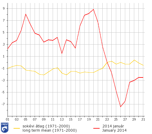 2014 januárja jelentősen melegebbnek bizonyult a megszokottnál: az ország legnagyobb részén a havi átlaghőmérséklet a sokéves normálnál 3-4°C-kal is magasabbnak adódott. A K-i határszélen alakult ki a legnagyobb anomália, itt átlagban 4-4,5°C-kal is melegebb volt a szokásosnál. Az országban sehol sem volt hűvösebb a harmincéves átlagnál, a legkisebb anomália mértéke is +2,5-3°C. Az interpolált adatok alapján hazánkban az idei volt a 7. legmelegebb január 1901 óta.