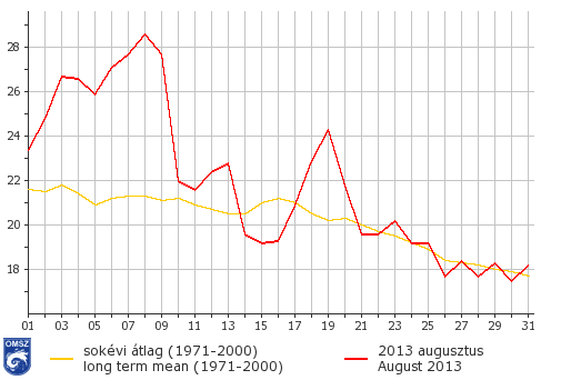 Augusztus első napjaiban hőhullámos időszakot éltünk át, mely a napi középhőmérsékletek országos átlagaiban is megmutatkozik: a megszokottnál jelentősen melegebb napokkal indult az idei utolsó nyári hónap. Augusztus 2-5. között 2. fokú, 6-9. között pedig 3. fokú hőségriadót rendelt el a tiszti főorvos (a másod-, illetve harmadfokú hőségriadó kritériuma a 25°C-ot, illetve a 27°C-ot elérő napi középhőmérséklet tartós, legalább 3 egymást követő napon való fennállása). 14-e és 17-e között visszaesés mutatkozik, majd 18-a és 20-a között a megszokottnál magasabb napi középhőmérsékleteket láthatunk a 3. ábrán. A hónap hátralévő részében az 1971-2000 közötti átlag körül alakultak a középhőmérsékletek.