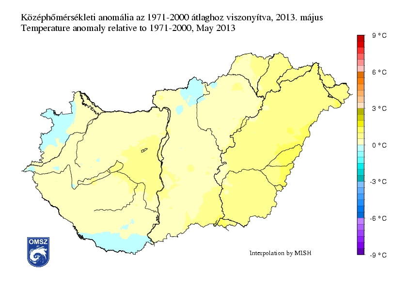 Pozitív hőmérsékleti anomália jellemezte hazánkat májusban (0-1°C), néhány kisebb terület volt ez alól csak kivétel a határszéleken (északkeleten, délen és északon egy-egy kis térségben 0°C és -0,5°C közötti hőmérséklet-különbség adódott). A legnagyobb eltérés a Körösök vidékén, valamint Szeged térségében jelentkezett, itt meghaladta a +1°C-ot.