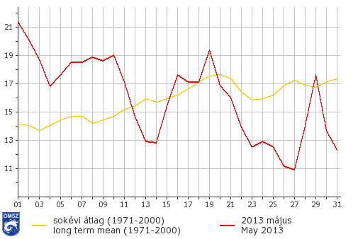 A hónap nyárias időjárással indult, országos átlagban 1-jén mértük a legmagasabb napi középhőmérsékletet (21,4°C), mely jóval (~7°C-kal) meghaladta az 1971-2000-es sokéves átlagot. A hónap legmagasabb hőmérsékletét is ebben az időszakban, 2-án regisztráltuk (32,5°C, Kelebia). 1-jén és 2-án is megdőlt a napi minimumhőmérséklet, valamint a középhőmérséklet sokéves napi maximumának rekordja. 11-étől egy ciklonális rendszer alakította hazánk időjárását, mely jelentős lehűlést hozott. A hónap közepén (16-19. között) jelentkezett még egy átlagot kissé meghaladó hőmérsékletű időszak, de ezután ismét a normál alá esett a hőmérséklet, mely a hónap végéig ki is tartott. Napi hidegrekord is született az időszakban, 26-án megdőlt maximumhőmérséklet sokévi napi minimuma (a Kékestető állomáson mért 6,6°C-kal). A leghidegebb nap országos átlagban 27-e volt (10,9°C), ekkor több mint 6°C-kal volt alacsonyabb a napi középhőmérséklet, mint a megszokott. A hónap legalacsonyabb hőmérsékletét is ezen a napon jegyeztük, Kékestetőn 1,7°C-ot regisztráltunk. Fagy egyetlen állomásunkon sem fordult elő májusban.