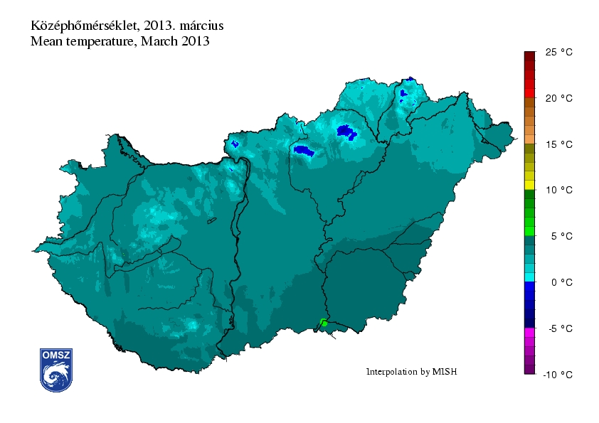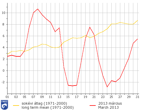 Az 1971-2000-es normálhoz viszonyítva, az idei március az egész országban hidegebb volt az átlagosnál. Délkeleten volt a legkisebb az eltérés, itt 0°C és -1°C közötti anomália jelentkezett. Az ország középső és délnyugati térségében -1°C és -2°C közötti volt az eltérés, míg az északi területeken -2°C és -3°C közötti anomália volt jellemző.