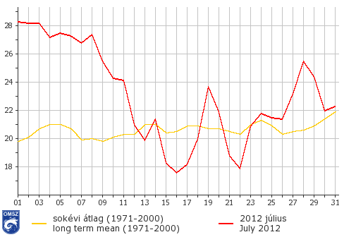 Az idei július a sokéves átlagnál melegebbnek bizonyult, országszerte az átlagnál legkevesebb 1,3 °C-kal mindenhol magasabb átlaghőmérsékletek voltak jellemzőek. A harmincéves átlagot leginkább meghaladó középhőmérsékletű területek az ország D-DK-i részein figyelhetők meg, itt akár 4 °C-kal is melegebb volt a megszokottnál.