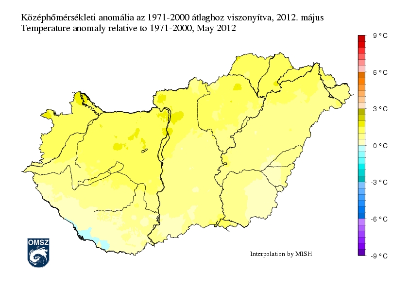 A középhőmérsékleti anomália térképen láthatjuk, hogy május hónap hazánkban az 1971-2000-es normálhoz viszonyítva valamivel melegebb volt, kivétel egy kisebb területet a déli határvidéken, ahol 0 és -1 °C közötti volt a különbség. Az ország déli és keleti felében 0-2 °C-os pozitív anomáliák rajzolódtak ki, míg északon ennél magasabb, 2-3 °C közötti volt a különbség, illetve a főváros térségében és hegységeink egyes területein 3-4 °C-kal is meghaladták az idei értékek a sokéves átlagokat.