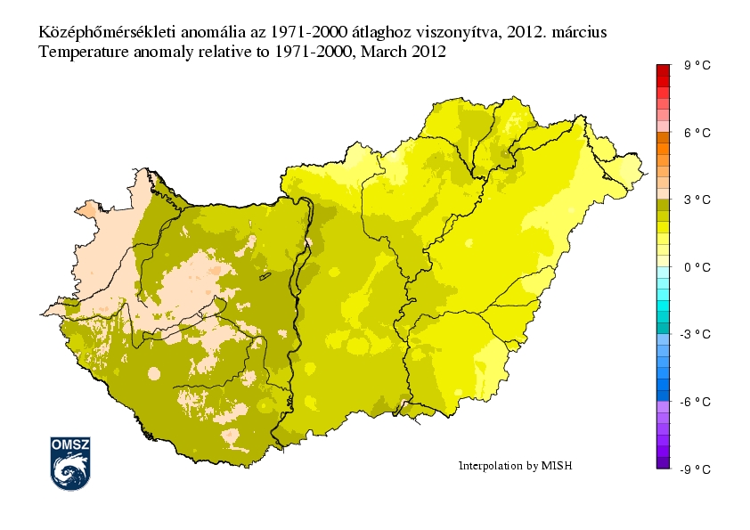 Az 1971-2000-es átlaghoz viszonyítva az idei értékeket, hasonló térbeli elrendeződést láthatunk, mint az előző térképen. Az egész országban melegebb volt a normál értékeknél, a legnagyobb eltéréseket a Dunántúlon tapasztalhattuk (2,5-4 °C), míg a Duna-Tisza közében 2-2,5 °C-os, az északi és keleti országrészben pedig 1-2 °C-os pozitív anomáliát mértünk.