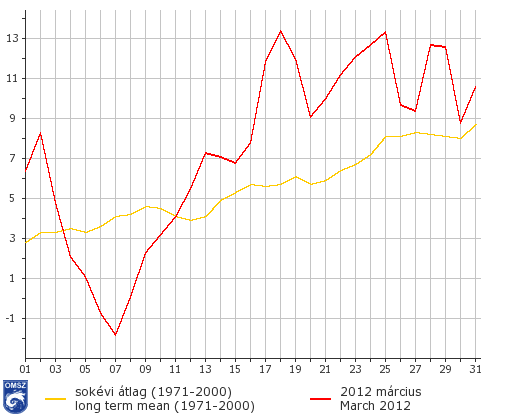 A hónap nagyobb részében átlag feletti hőmérséklet volt jellemző, csupán a 4-10-e közötti időszakban alakult a normál alatt a napi középhőmérséklet országos átlagban. A leghidegebb nap (március 7.) ebben az időszakban volt, amikor is -1,8 °C-os középhőmérsékletet mértünk, mely 5 °C-kal maradt el az átlagtól; valamint ezen a napon észleltük a hónap legalacsonyabb hőmérsékletét is (-14,1 °C, Zabar). 10-e után kisebb-nagyobb ingadozásokat figyelhettünk meg a napi középhőmérséklet alakulásában, de végig a normál felett maradtak az értékek. A legmagasabb napi átlaghőmérsékleteket (13 °C feletti átlaghőmérsékletet) 18-án és 25-én mértük.