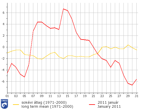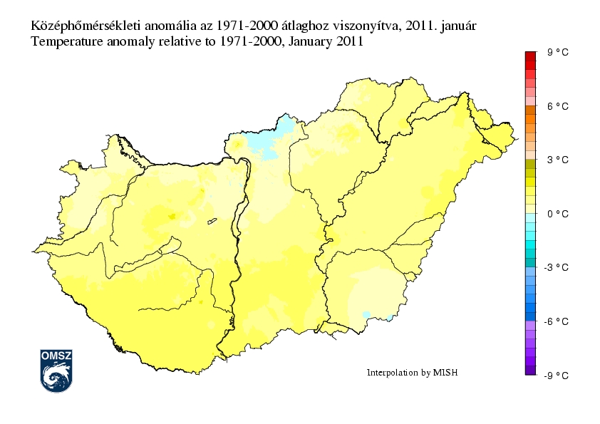Az ország túlnyomó részén az átlagosnál 1 °C-kal vagy annál is enyhébb volt az idei január. Főként a délnyugati országrészben a hőmérsékleti anomália a +2 °C-ot is megközelítette. Jórészt csak Nógrád megyében uralkodott alacsonyabb hőmérséklet, de az értékek itt is csak 0,5 °C-kal maradtak a sokéves átlag alatt.