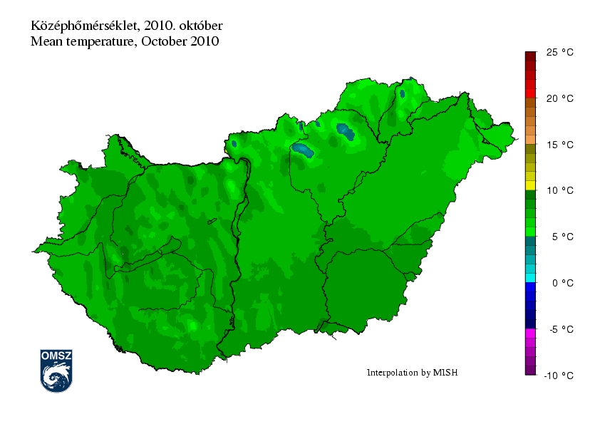 Országszerte több fokkal hűvösebb volt a sokéves átlagnál. A Dunántúlon 1-2 °C-kal maradt el a havi középhőmérséklet a szokásostól, míg hazánk keleti részében az átlagtól való eltérés a -3 °C-ot is megközelítette.
