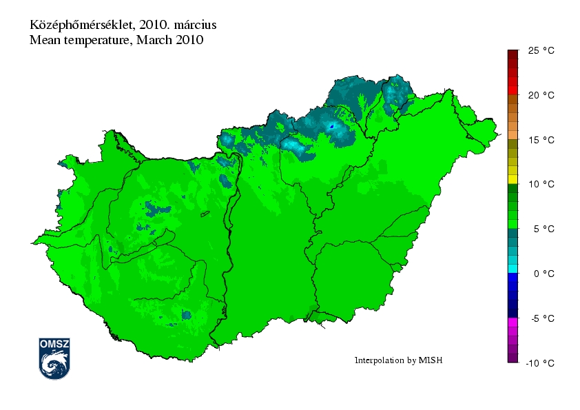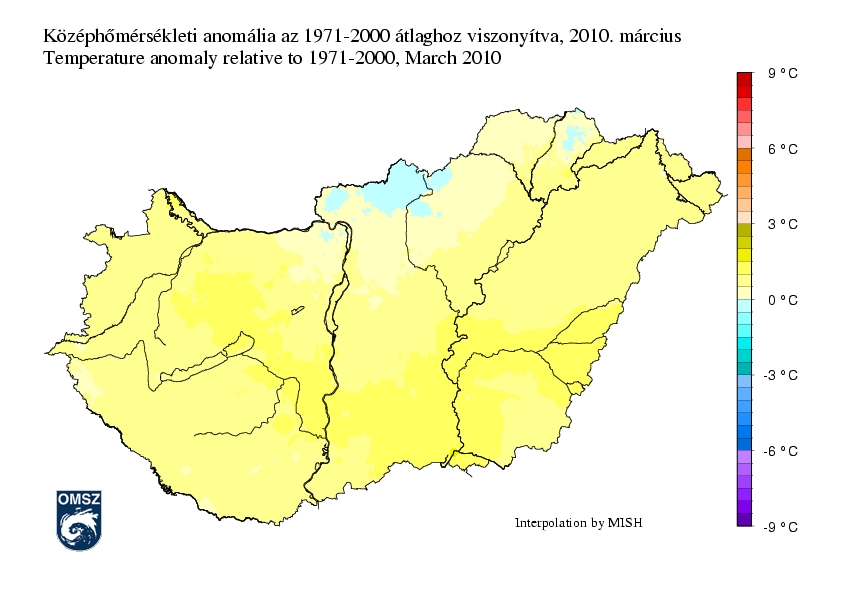 Bár az első tavaszi hónap a szokásosnál melegebb idővel érkezett, a napi középhőmérsékletek a március 3-tól 17-ig terjedő időszakban a sokévi átlagnál lényegesen alacsonyabbak voltak. A március 17-én kezdődő folyamatos és intenzív melegedés következtében a napi középhőmérsékletek a hónap második felében országos átlagban már újra meghaladták az ilyenkor szokásos értékeket.