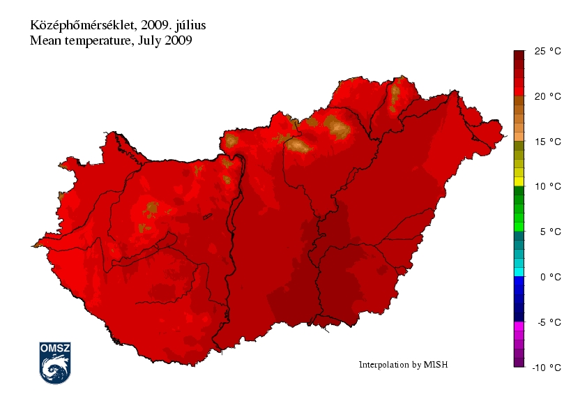 Az ország teljese területén pozitív hőmérsékleti anomália adódott július hónapban. Főként az alföldi területeken az eltérés mértéke 1,5 - 2 °C közöttinek adódott. Az ország többi részén a havi középhőmérséklet 1 – 1,5 fokkal volt a sokévi átlag felett.