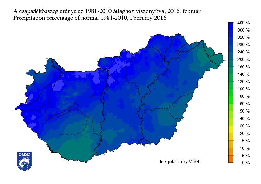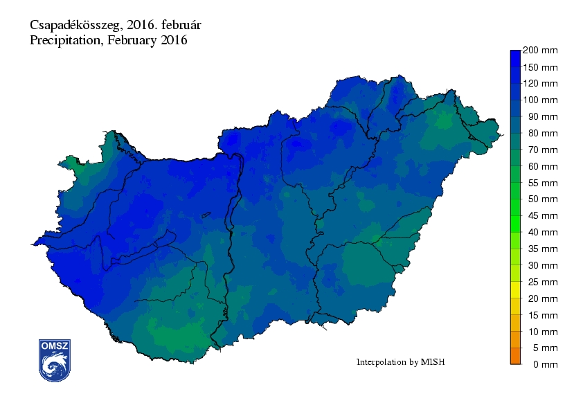 A február meglehetősen csapadékos volt, országos átlagban 98 mm hullott le, ezzel a legcsapadékosabb februárnak számít a mérések kezdete óta. A legkevesebb csapadék a Mecsek, a Nyírség és a Körösök-mentén volt, ezeken a területeken mintegy 60-70 mm havi összegeket jegyeztünk. Az Északi-középhegység magasabban fekvő területei, a Bakony térsége, valamint hazánk nyugati része bizonyultak a legcsapadékosabbnak. Itt a havi csapadékmennyiség értéke elérte a 200 mm-t is.
