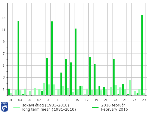 A legtöbb csapadék országos átlagban 29-én hullott (13,7 mm), ezt követi a 3-i és a 10-i mennyiség (12,4 mm). A 4-e és 7-e közötti napokban hazánk teljes területének átlagában nem hullott számottevő csapadék. Egy havas napot jegyeztünk a sokéves átlag alapján megszokott 6 havas nap helyett.