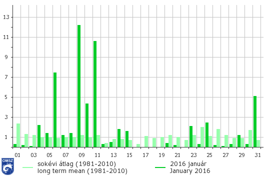 2016 januárjában a megszokotthoz képest a legnagyobb csapadéktöbblet egy az országot délnyugat-északkelet irányban átszelő sávban hullott. Itt az 1981-2010-es normálértéknek 200-240%-át, kisebb területeken 240-280%-át figyelhettük meg. A Dunakanyarnál és a Bakony egyes részein a szokásos csapadékmennyiségnek általában 100-120%-át regisztráltuk, de kisebb foltokban előfordult, hogy a csapadék mennyisége nem érte el a 100%-ot.