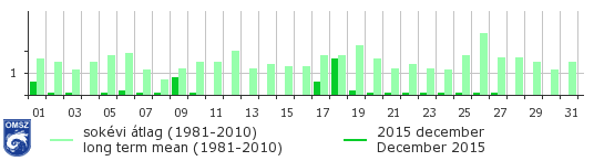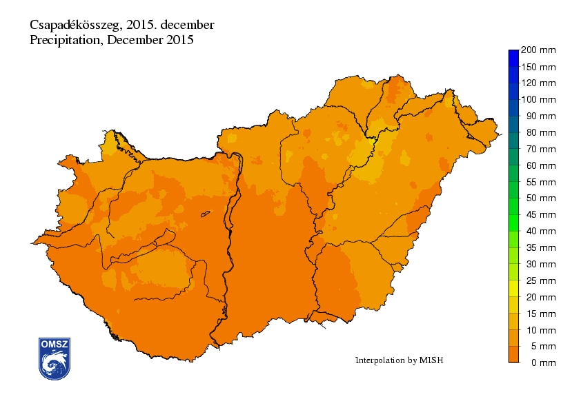 A december igen száraz hónapnak bizonyult. A csapadék mennyisége országos átlagban 5,4 mm volt, ami 41,6 mm-rel kevesebb az ilyenkor szokásos csapadékmennyiségnél (47 mm). A csapadék területi eloszlása változatos képet mutat. Az ország középső, déli és délnyugati tájain hullott a legkevesebb csapadék, ezeken a területeken általában csapadéknyomot regisztráltunk, amely leginkább ködszitálásból eredt. A legnagyobb havi csapadékmennyiség összeget Tiszaújváros környékén mértük. Itt a csapadék mennyisége meghaladta a 20 mm-t is.