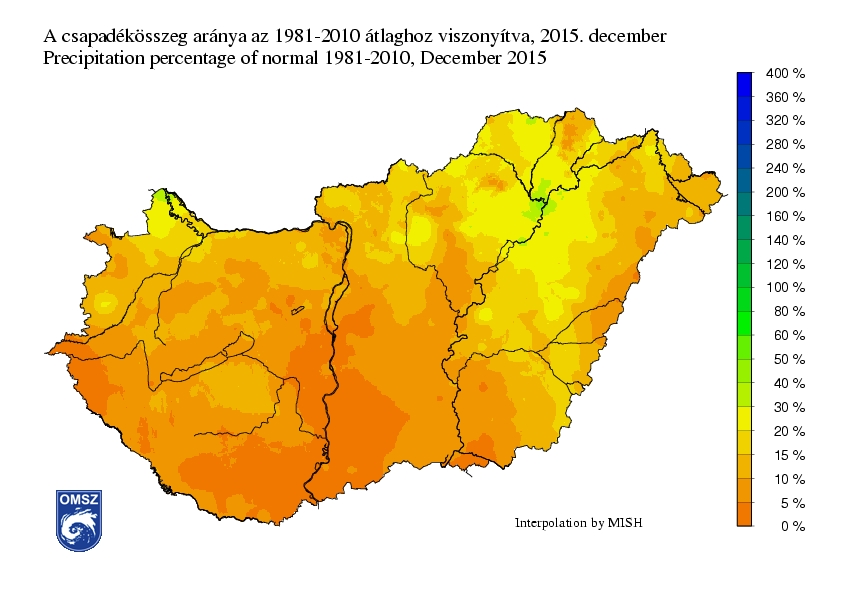 Az ország középső és délnyugati részein az ilyenkor szokásos havi csapadékmennyiség kevesebb, mint 5% a hullott le. A Tiszántúlon és a Kisalföld egyes részein a sokévi átlagnak mintegy 20%-át, Tiszaújváros környékén több mint 60%-át regisztráltuk.
