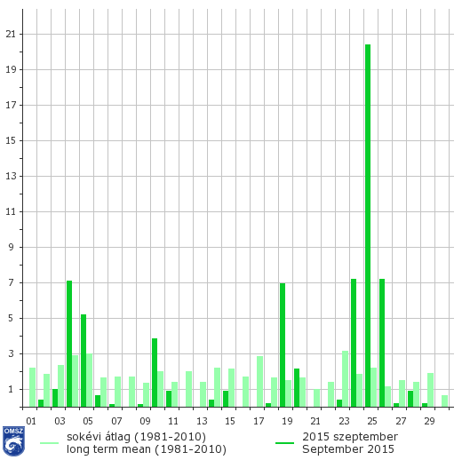 2015 szeptemberében a legcsapadékosabb nap 25-e volt, amikor országos átlagban több, mint 20 mm csapadék hullott, ezen kívül még 5 napon esett 5 mm-nél több eső, a hónap első felében 4-én, 5-én, a második felében 19-én, 24-én és 26-án.