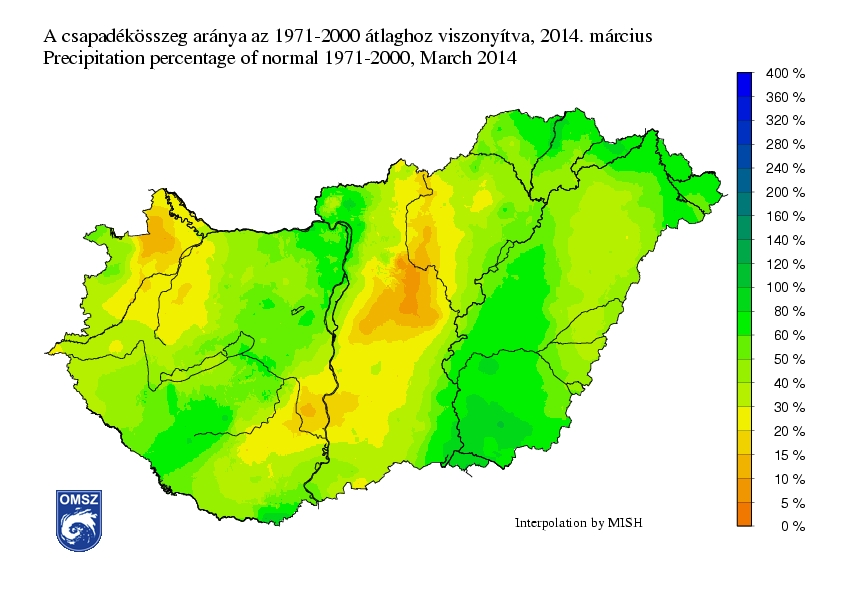 Jellemzően a megszokott csapadékmennyiség 40-50%-a hullott le hazánkban március folyamán. A Kisalföld térségében és a Duna-Tisza-közén jelentős csapadékhiányról számolhatunk be (a normál 10-30%-át jegyeztük). Csak délkeleten közelítette meg a havi csapadékmennyiség az 1971-2000-es éghajlati normál értékeit (80-100%). A márciusi országos átlagos csapadékösszeg 14,4 mm-nek adódott, mely a sokéves átlag mindössze 45%-ának felel meg.