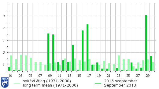 A csapadékanomáliát tekintve – a nyári nagy szárazság után végre – az idei szeptemberi összeg kevéssel a sokévi átlag felett alakult országos átlagban. A nyugati-délnyugati területeken csapadéktöbblet jelentkezett, itt a normál 120-200%-a volt jellemző (sőt a déli határszélen 200-280% közötti arány is előfordult), az ország északkeleti felében azonban elmaradtak az idei értékek a normáltól, csupán 40-80%-a hullott a sokévi átlagnak.