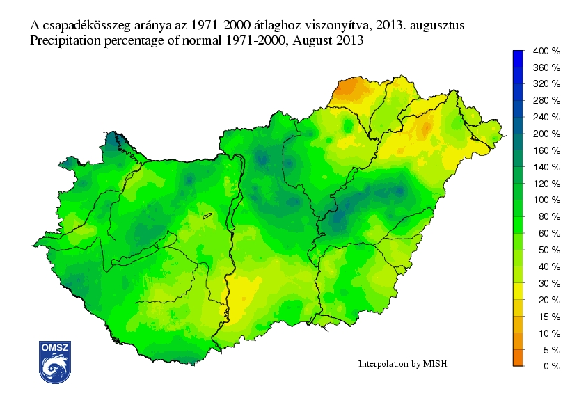 A júliusi szárazság után az augusztus jó részét is a kiterjedt csapadékhiány jellemezte; bőven akadt olyan terület a hónap folyamán, ahol szinte egyáltalán nem, vagy csak alig esett eső. A legkevesebb csapadék D-en és ÉK-en hullott (0-25 mm között), a legcsapadékosabbnak pedig a nyugati határszél, a Balaton környéke és a Tiszántúl középső területe bizonyult (60-120 mm).