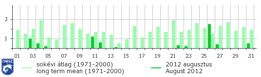 2012 augusztusában országos átlagban mindössze 11 napon hullott mérhető csapadékmennyiség hazánk területén, amely jelentősen elmarad a sokéves átlagtól. A legcsapadékosabb nap 26-a, ekkor az országos átlag 2,2 mm, a legnagyobb csapadékösszeget pedig ezen a napon Csárdaszállás állomásunkról jelentették (23,5 mm).
