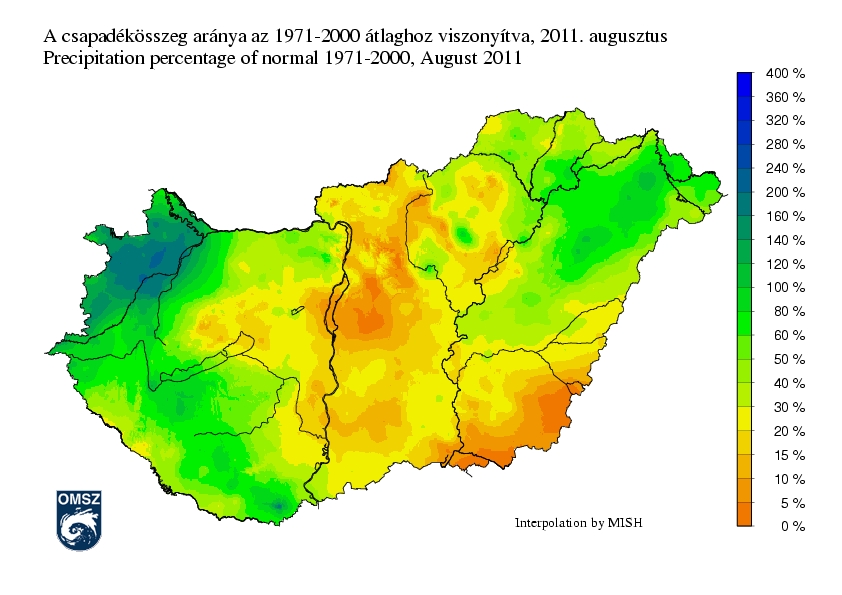 Széles határok között mozgott a havi csapadéknak a sokéves átlaghoz viszonyított aránya is, összességében azonban egy az átlagnál szárazabb hónap képe tárul elénk. A Duna-Tisza közében a csapadékösszegek a szokásos mennyiség 25%-át sem érték el. A csapadéktérképhez hasonlóan a csapadékhozamok aránya is az északnyugati országrészben volt a legnagyobb. Az ország többi részét jelentősen elhagyva, az értékek itt a másfélszeres, kétszeres mennyiséget is meghaladták.