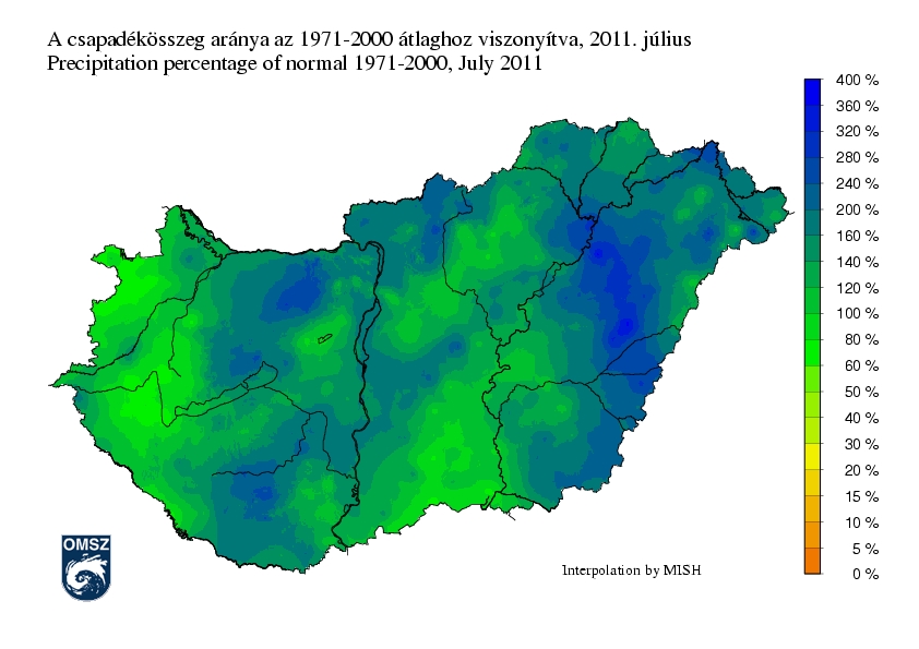 Hazánk nagy részén több csapadék hullott a szokásosnál, ez alól kivételt csupán a Dunántúl nyugati része és az Alföld déli határa jelentett. Követve a csapadék eloszlását a legnagyobb eltérések a legcsapadékosabb területeken rajzolódtak ki. Míg a Dunántúlon 2-3-szoros értékek, a Tiszántúlon 4-szerest megközelítő értékek is megjelentek.