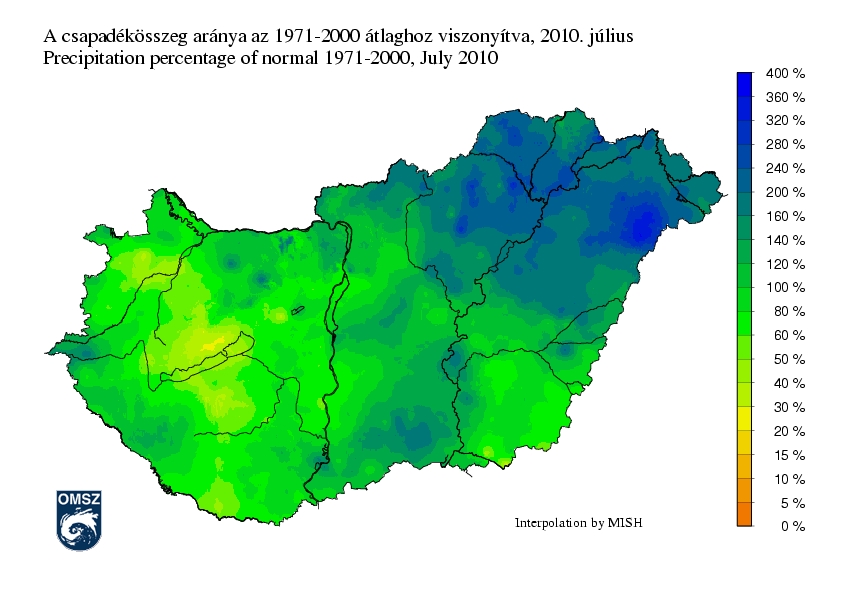 Júliusban a havi csapadékösszegek országszerte igen tág határok között, általában 20 és 200 mm között alakultak. 100 mm feletti csapadékösszegeket Északkelet-Magyarországról, illetve a Vasi-Hegyhát térségéből jelentettek. A legkevesebb csapadék az elmúlt hónapban a Rábaközben, a Balaton-felvidéken, valamint a délkeleti határ mentén hullott.