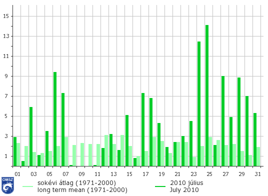 Országos átlagban a július csapadékosnak mondható. Mindössze két nap volt, amikor nem hullott csapadék. Különösen a hónap második felében volt országos átlagban is jelentősebb csapadéktevékenység. A csapadék maximuma 24-én és 25-én volt, ekkor átlagosan 12-14 mm csapadékot mértek naponta.