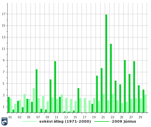 Országos átlagban 10 mm-t meghaladó mennyiségű napi csapadékösszeg két napon adódott, 22-én és 23-án. Mindezek mellett a 24 óra alatt lehullott legnagyobb csapadék 11-én adódott Taktaharkányban. Több napon is előfordult lokálisan nagy mennyiségű csapadék felhőszakadás, jégeső, zivatar kíséretében. Június 11-én Adács térségében tornádót figyeltek meg.