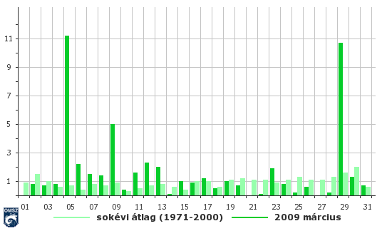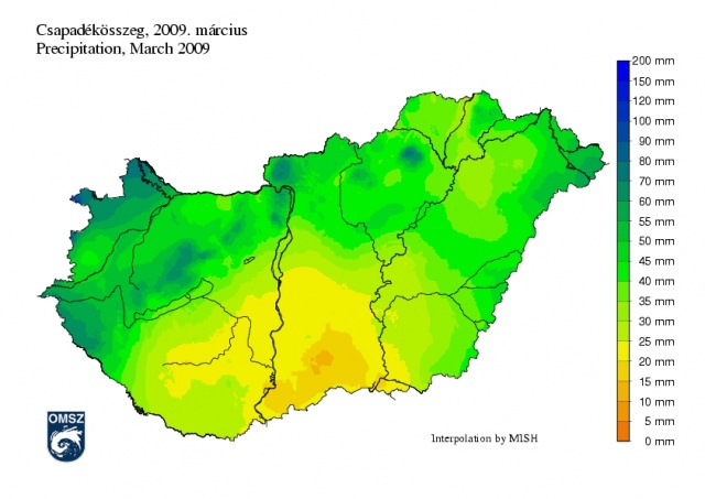Országos átlagban 2009 márciusa átlagos hőmérsékletű, csapadékban gazdagabb volt.