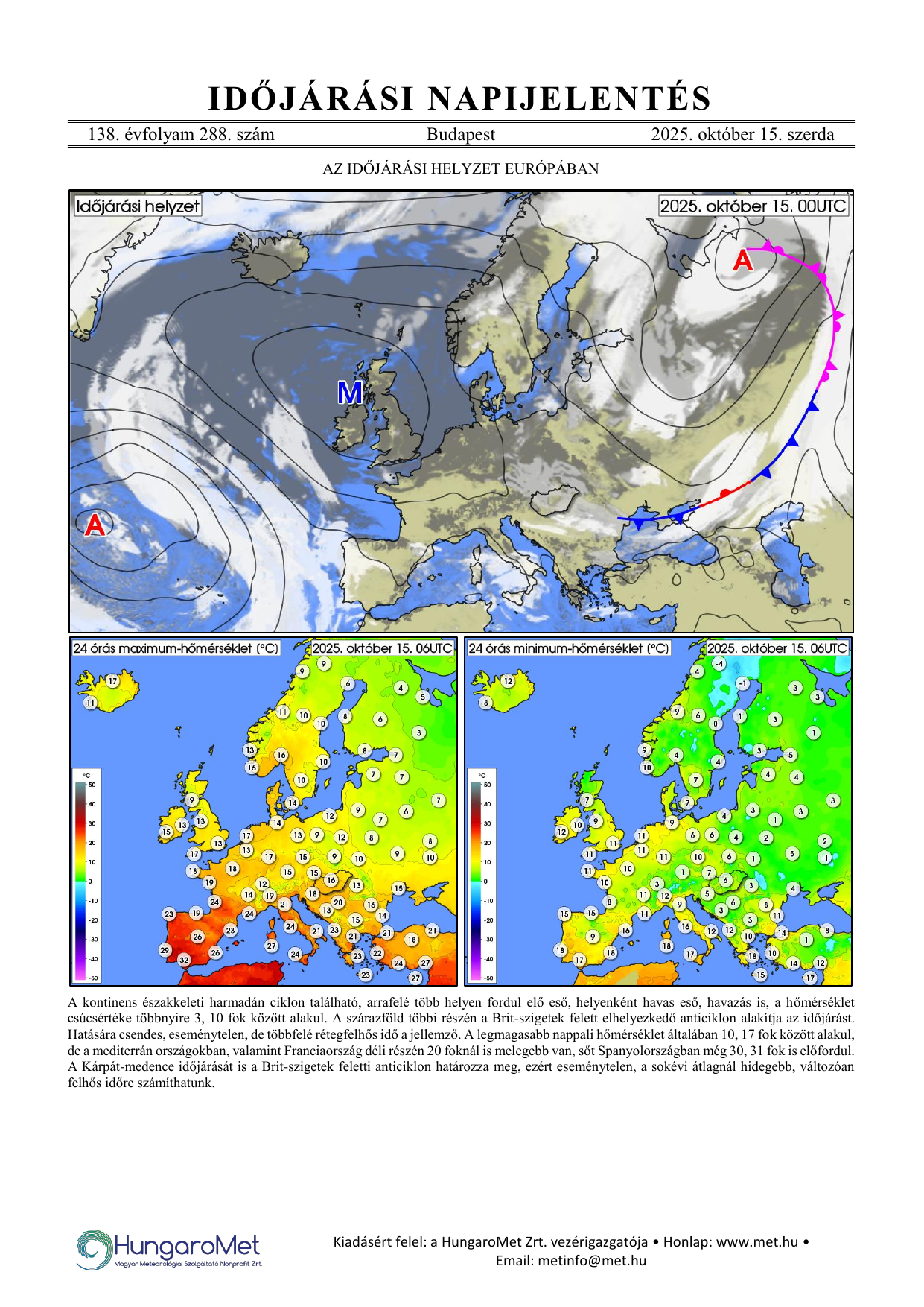 Az európai kitekintés a fronttérkép és a rövid szöveges elemzés mellett bővül a hőmérséklet napi minimum- és maximumértékeit ábrázoló térképekkel.