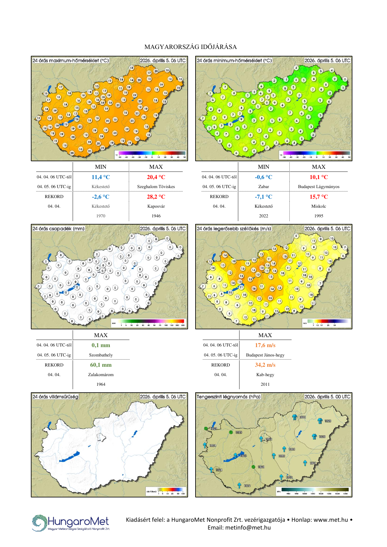 A meteorológiai elemek Hungaromet Zrt. által mért napi értékei ezentúl kontúrtérképeken jelennek meg, de továbbra is tartalmaznak konkrét számértékeket, a korábbinál jóval több állomásról. A térképek alatt táblázatos formában feltüntetjük a napi szélsőértékeket és az abszolút napi rekordadatokat. Az eddigiektől eltérően a napi (24 órás) adatok egységesen, 06 és 06 UTC közötti időszakot fednek le – nagyobb összhangban a nemzetközi gyakorlattal. Az abszolút napi rekordok időszakának tekintetében a hazai évtizedes gyakorlat a következő (rekord napja = aznap):